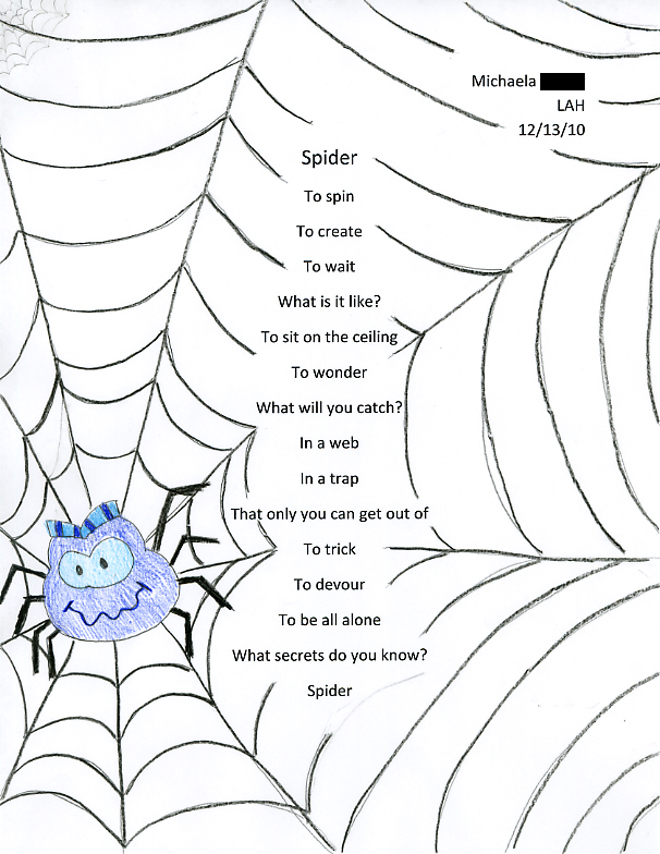 Please enjoy these poems and illustrations presented by Berdine Leinbach's 8th Grade Language Arts Classes at the Indian Valley Middle School. The work was completed in December, 2010 in response to PoetryWITS' Visiting Poets program. The lesson outline is also available on our website - HERE.