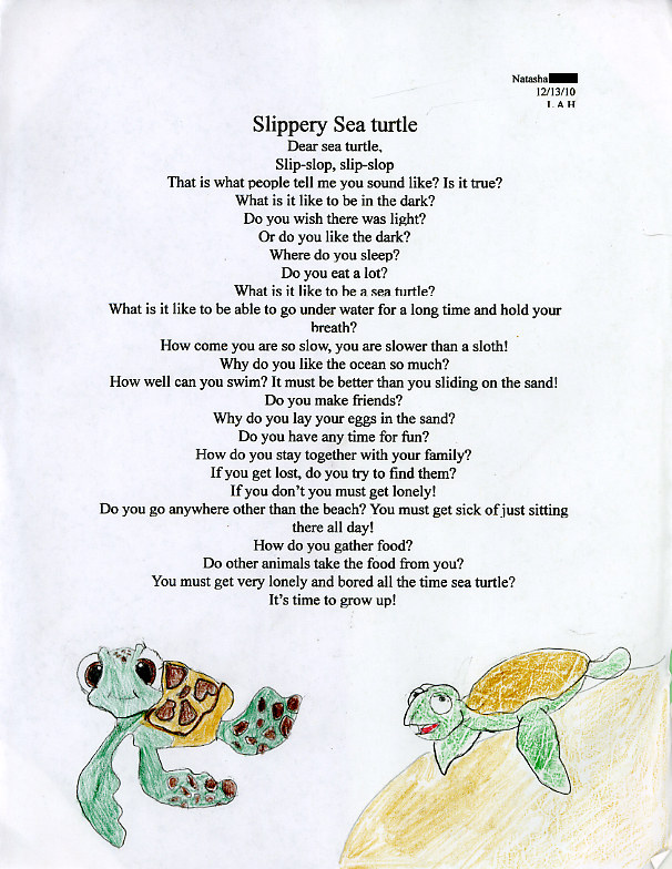 Please enjoy these poems and illustrations presented by Berdine Leinbach's 8th Grade Language Arts Classes at the Indian Valley Middle School. The work was completed in December, 2010 in response to PoetryWITS' Visiting Poets program. The lesson outline is also available on our website - HERE.