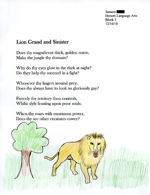 Please enjoy these poems and illustrations presented by Berdine Leinbach's 8th Grade Language Arts Classes at the Indian Valley Middle School. The work was completed in December, 2010 in response to PoetryWITS' Visiting Poets program. The lesson outline is also available on our website - HERE.