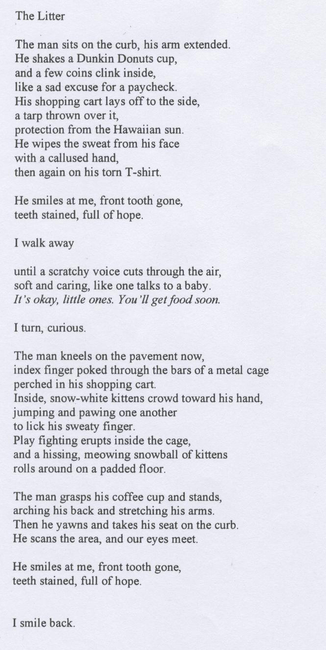 COMMENTS FROM CONTEST JUDGE MARIE KANE: One of the most important aspects of this poem is its description; the reader is able to clearly hear and see the poem's elements. It concerns the byplay between an apparently homeless man who asks for handouts while nurturing a "Litter" of kittens in his shopping cart, and the speaker who initially dismisses the man, and later, accepts him. The first section describes how the speaker meets the man. He "sits on the curb, his arm extended. / He shakes a Dunkin Donuts cup, / and a few coins clink inside, / like a sad excuse for a paycheck." This original simile gives information about the dire straits of the man asking for a handout. The poet then goes on to describe that the man's "shopping cart [that] lays off to the side, / a tarp thrown over it, / protection from the Hawaiian sun." I like that this writer puts the reader into the setting of the poem and gives a definite feel for the climate. Another strong visual appears when the man "wipes the sweat from his face / with a calloused hand / then again on his torn T-shirt." The next short two lines describe the man's actions: