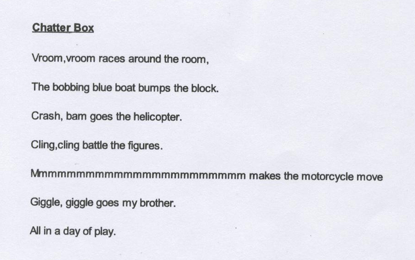 COMMENTS FROM CONTEST JUDGE MARIE KANE: "Chatter Box" is a fun poem to read-especially aloud; its use of onomatopoeia, rhyme, repetition, and alliteration make this poem a clear winner. In seven lines, this poet cleverly describes his brother's active play day, although the writer appropriately waits till the end of the poem to introduce the brother and explain the reason for the toys and their sounds. The perfect title, "Chatter Box," is a skillful take on the phrase for a talkative person; in this poem, the term refers to the speaker's brother and the vivid noises he makes while playing. The poem's opening line, "Vroom, vroom races around the room," immediately captured my attention. Its use of the four poetic devices listed above would challenge many an older poet. The second line also captivates: "The bobbing blue boat bumps the block"; the use of alliteration makes this line not only enjoyable to say, but also reveals the poet's originality with the 'b' and 'bl' repetitive sounds. The writer moves onto the letter 'c' in the next two lines: