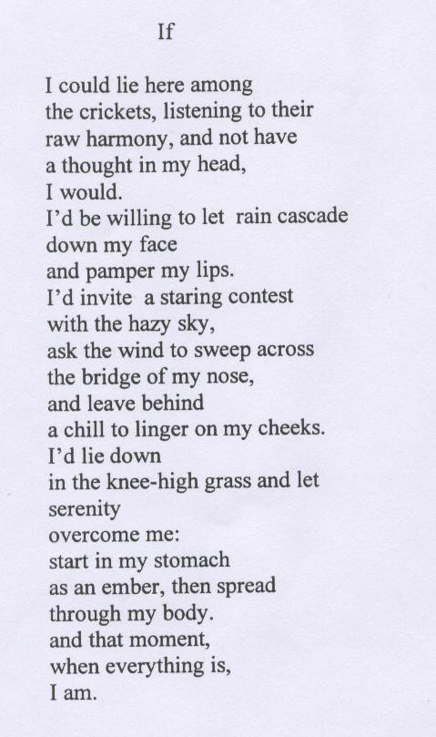COMMENTS FROM CONTEST JUDGE MARIE KANE: The second place poem in this age group exhibits a mature voice, expert command of line breaks, and the use of imaginative diction to command the reader's attention throughout this admirable, understated poem. The first five lines invite us into the speaker's realm of possibility. The title of the poem, "If," is its first line. Next are: